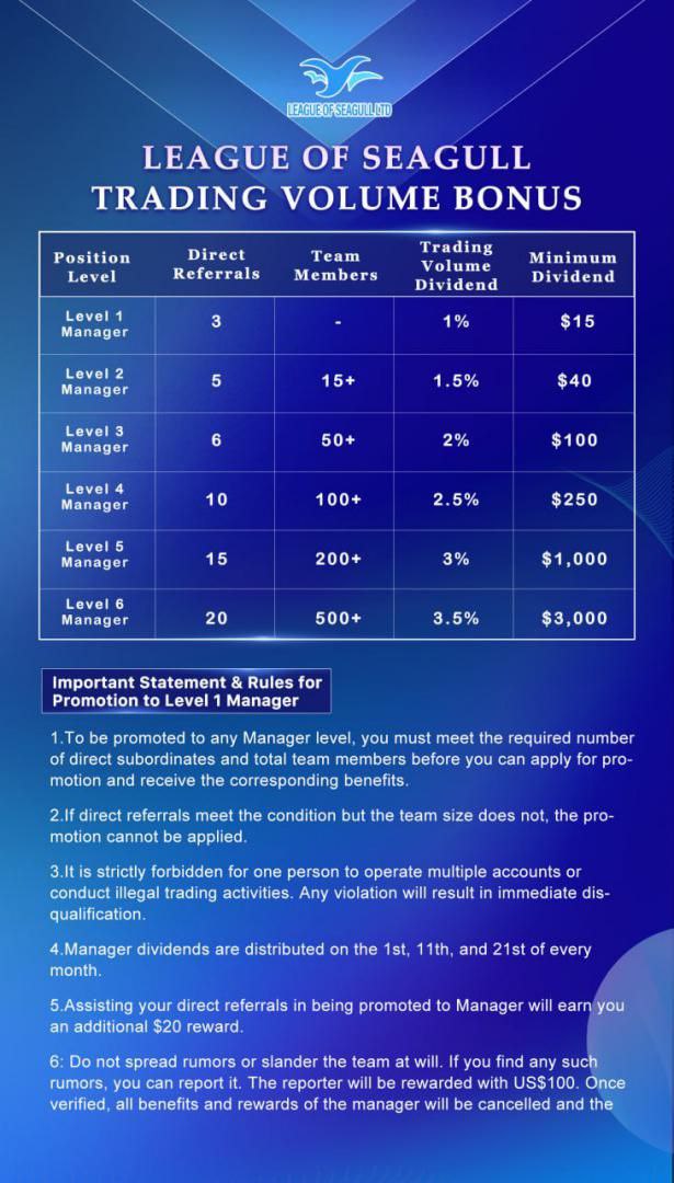 As part of the League of Seagull, your income grows with your team. Manager pathways unlock guaranteed 10-day income based on team trading volume.